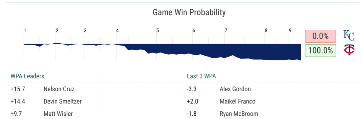This was a bullpen game for the Twins, and they nearly turned in a shutout. Matt Wisler opened the game with two no-hit innings to lower his ERA on the season to 1.50. What a find he’s been so far. Devin Smeltzer was the primary pitcher, delivering 2 2/3 innings of scoreless ball while striking out three batters.