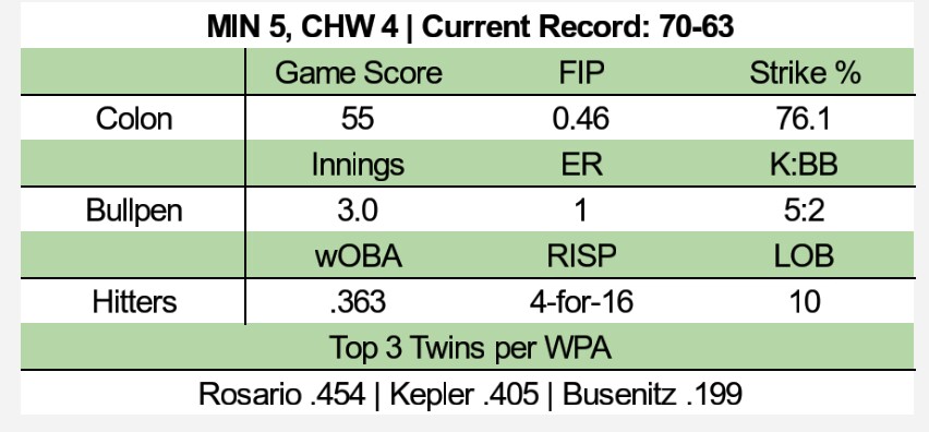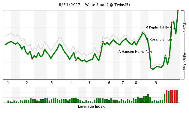 With David Robertson traded away, the White Sox have a lot of uncertainty in the back end of their bullpen, too. Juan Minaya, who entered the game with three career saves, coughed up the lead in the bottom of the ninth. Ehire Adrianza led off the inning with a pinch-hit single. Zack Granite popped out on a bunt attempt for the first out, but thank goodness in the end it didn’t matter. Brian Dozier walked, Rosario hit a game-tying single and Joe Mauer walked to load the bases.
