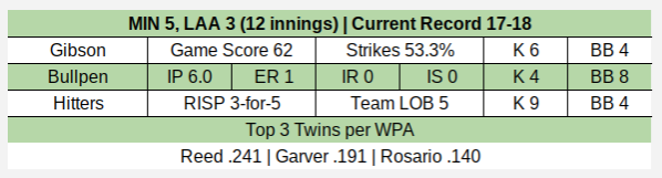 From there forward, the bats were incredibly quiet, allowing the Angels to get back in the game. In the 12th inning Rosario reached on an infield single and Garver pulled a double down the left field line that scored Rosie all the way from first base, putting the Twins up. Mitch scored from second on a Gregorio Petit single to provide an insurance run.
