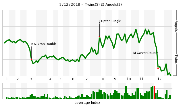 Other odds & ends: Garver was charged with a passed ball in the inning LA tied the game. Rosario stole second in the ninth … but overslid the bag and was tagged out to end the inning. The no-doubles defense saved the Twins from being walked off in the bottom of the ninth. Mauer swung at a 3-0 pitch (and grounded out). The Twins walked Trout in four of his six plate appearances.