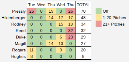 Here’s a quick look at the number of pitches thrown by the bullpen over the past five days: