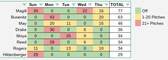 Here’s a quick look at the number of pitches thrown by the bullpen over the past five days: