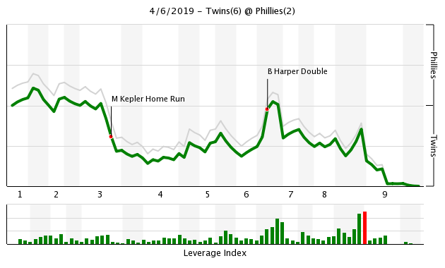 A shallow fly ball was hit to center, Buxton did a nice job of getting himself set to make a play, but Harper took off for home anyway. The throw was a bit up the line, but Willians Astudillo was able to reel it in and tag out a leaping Harper for a double play.