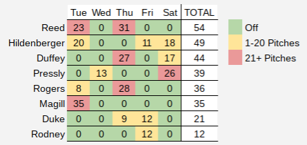 Here’s a quick look at the number of pitches thrown by the bullpen over the past five days: