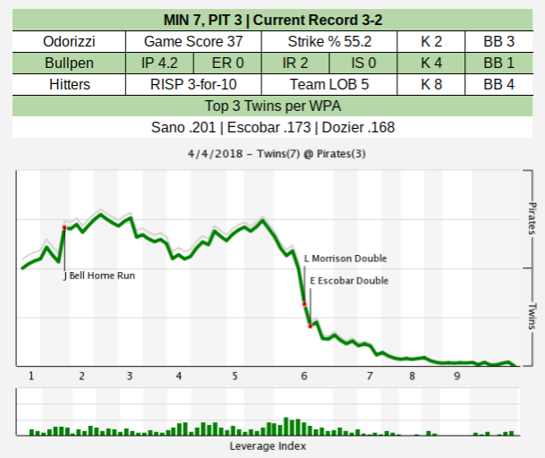 It wasn’t a great night, however, for Twins starter Jake Odorizzi. He gave up a two-out homer to Josh Bell in the first inning and another run in the fourth. He had walked only one batter through 4.1 innings, but then issued free passes to the next two men he faced. Those would also be the last two hitters Odorizzi faced.