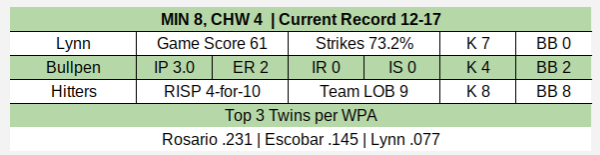 The Twins were leading 8-2 when Lynn exited, allowing Matt Magill and Phil Hughes to get in some low-leverage work. Magill gave up a run in his two innings, but also struck out three batters. Hughes gave up a solo home run in his inning of work.