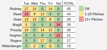 Here’s a quick look at the number of pitches thrown by the bullpen over the past five days: