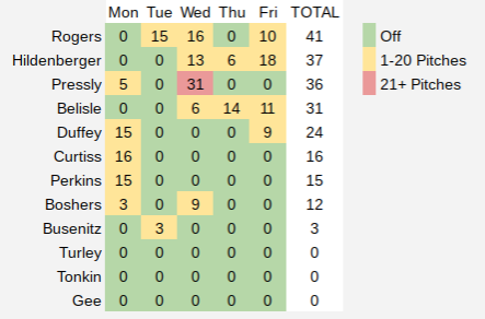 Here’s a quick look at the number of pitches thrown by the bullpen over the past five days: