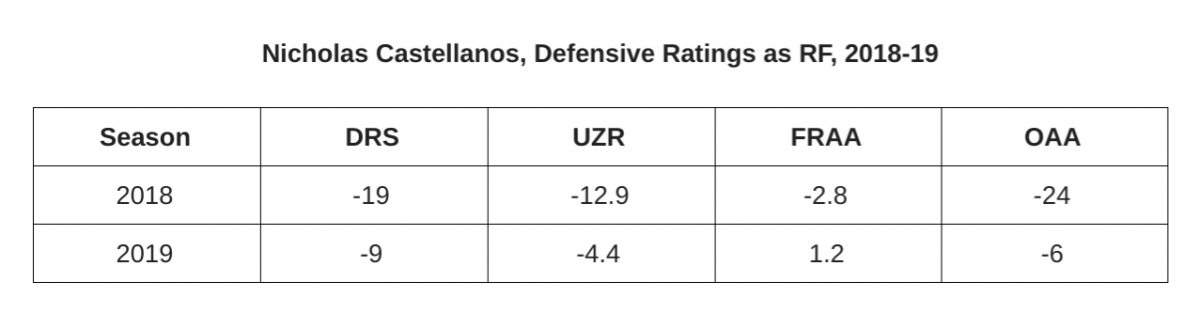 The day after that article ran, Castellanos played his first game of the season in right field. He played two more games at third at the end of the season, but otherwise, has never returned to the dirt. He’s played over 2,500 innings in right field since September 2017. At first, he was a total butcher out there, too. However, his numbers improved considerably from 2018 to 2019: