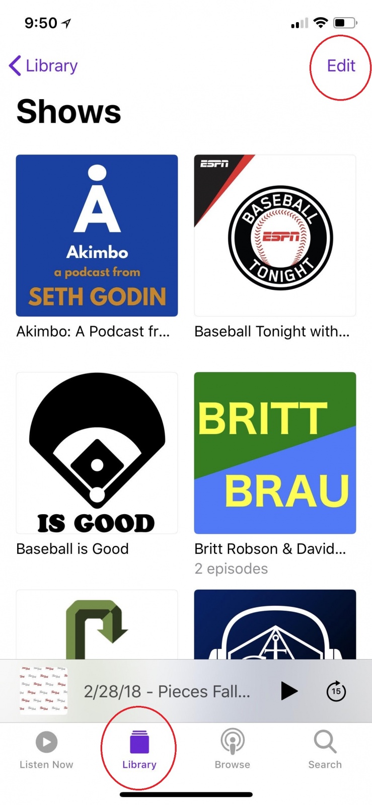 2. Go into your iPhone podcast app and click on the "Library" tab at the bottom and then click on "Edit" in the upper right-hand corner: