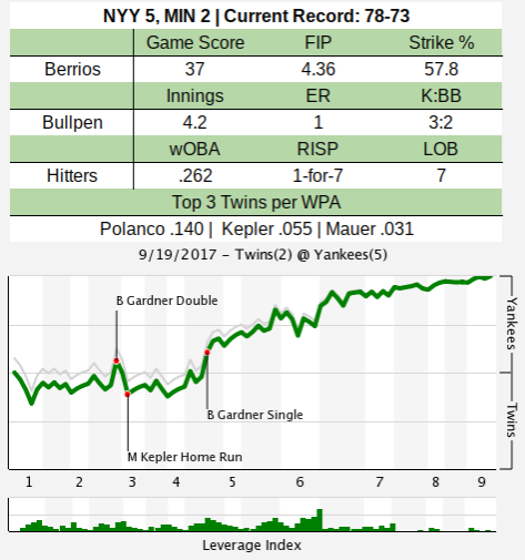 Jose Berrios didn’t have his best game tonight. I doubt he’ll make excuses, but I’ll offer some up on his behalf. First off, the Yankees are always a tough team to pitch against. They’re so patient. Second, this was Jose’s first time pitching in Yankee Stadium. That’s a pretty big moment for any ballplayer. Third, this was his first start since his wife gave birth to their third child. And fourth, Hurricane Maria was on the verge of hitting his home country of Puerto Rico as this game got underway.
