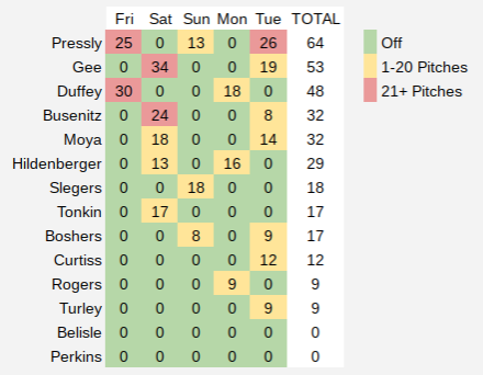 Here’s a quick look at the number of pitches thrown by the bullpen over the past five days: