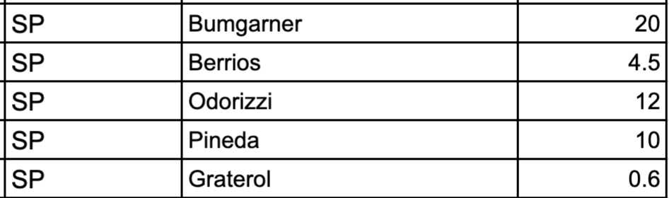 On the pitching side, I'm calling for a fundamental shift. Bumgarner and Berrios are your two traditional starters, aiming for 200 innings and 20 wins. Meanwhile, Odorizzi will have a 5-to-6 inning routine, asking him only to continue the formula he excelled with this year. That'll roughly be the plan for Pineda as well once he joins, after having his spot filled by someone like Randy Dobnak for two months.