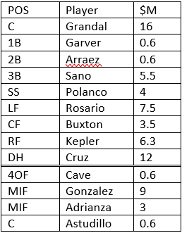 Other than that, the offense stays pretty much the same. The 26th roster spot allows Astudillo to stay on the roster and occasionally catch, alleviating any Gardenhire-esque anxiety Rocco Baldelli may have about using Grandal or Garver as DH without a third catcher. Marwin Gonzalez remains a great insurance piece as the super-utility man and Ehire Adrianza and Jake Cave fill out a strong bench.