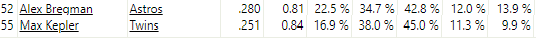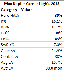 Looking at the hard-hit rate leader boards Kepler finds himself sitting 55th among qualified hitters. Three spots up from him at 52nd is the Astros Alex Bregman. In 2018 Bregman owns a .900 OPS thanks to a .277/.381/.519 slash line. His 22 home runs are a career high, and he was named an All-Star for the first time this summer. Bregman owns a virtually identical GB/FB rate as Kepler (0.81 to 0.84), and their batted ball profiles are eerily similar. What helps to distance the Houston infielder is the added lift he gets on the baseball. With an average launch angle of 16.3 degrees (and 28.8 degrees on home runs) Alex is getting enough of a process boost to significantly impact his results.