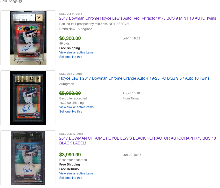 Recent auction sales have Lewis’ 1st Bowman card, in an ungraded state, fetching a comfortable $135+. When looking at some of his lowest numbered and most elusive cards, resellers are cashing in for well into five-figure sums. Like his teammate, Kirilloff’s card stock is performing wonderfully as well. Recent graded sales of Kirilloff’s 1st Bowman are trending just under $200 with the elusive parallels commanding significantly more.