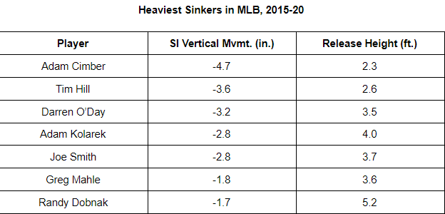 As he’s made mechanical and technical adjustments this season, Dobnak has turned a sinker that already had exceptional depth into the single heaviest pitch of its kind in the majors. With his low-three-quarter arm slot, Dobnak gets good sink, but he’s become more efficient this year, maintaining better posture and tilting his spine less as he drives through release. That’s pushed his release point down, and a minor change to his grip of the pitch has also helped increase the drop on the offering.