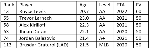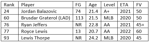 After getting over the exclusion of the aforementioned outfield duo, the next big surprise is that both catcher Ryan Jeffers and starter Lewis Thorpe make the list. Jeffers has gained a lot of helium and was up to number seven on the Twins Daily list (sixth without Graterol), but this is certainly the first list that includes him in the top 100. On the one hand, Jeffers’s improvement in the area of pitch framing and overall defense would seem to favor him more on traditional, scouting-based lists, but his proficiency with the bat as a catcher, and the fact that he reached and played well at AA in 2019, undoubtably boosted his projections.