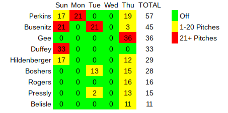 Here’s a quick look at the number of pitches thrown by the bullpen over the past five days: