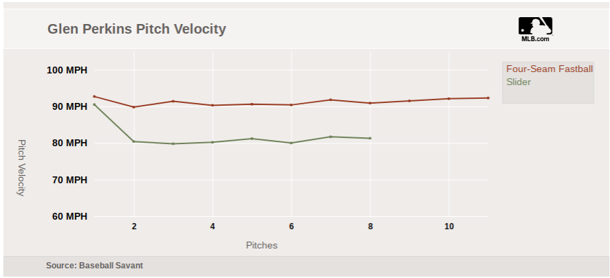 It was a long journey back from torn labrum surgery, and Perk deserves credit just for working his way back to a big league mound, but he’ll hope for better results the next time out. He faced six batters and only got one out, surrendering two runs on a pair of singles, two hit batsmen and a walk. Below are Perkins’ velo readings from the game via Baseball Savant. He averaged 91.3 mph on his fastball. He was at 93.7 back in 2015.