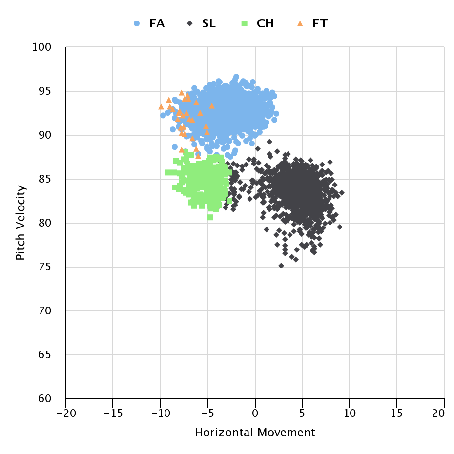 Let’s go back to the fastball and changeup, which end up with about the same movement. Here is another chart from that FanGraph’s page that shows the movement horizontally, but the velocity is on the vertical axis.