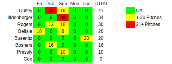 Here’s a quick look at the number of pitches thrown by the bullpen over the past five days: