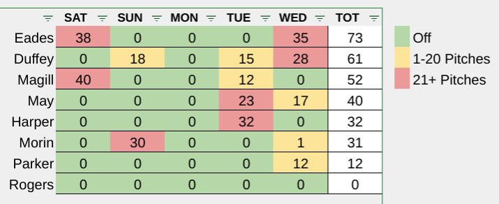 Here’s a quick look at the number of pitches thrown by the bullpen over the past five days: