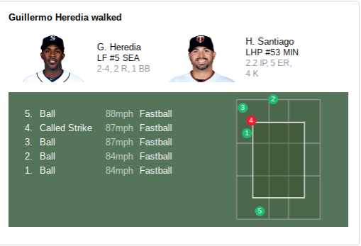 Santiago did not look right from the get-go. Below is a visual on how he fared against the first batter of the game (via Yahoo), the location is obviously an issue, but note the velocity, as well.