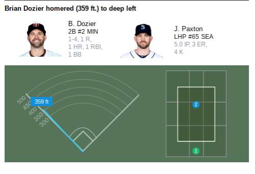 Brian Dozier hit his ninth home run of the season on a prototypical Dozier homer. The pitch was left up and he pulled it right down the left field line. The Twins are now 4-4 when Dozier homers (he had a two-homer game), but oddly enough they're 12-2 when Miguel Sano goes deep. (data below from Yahoo)