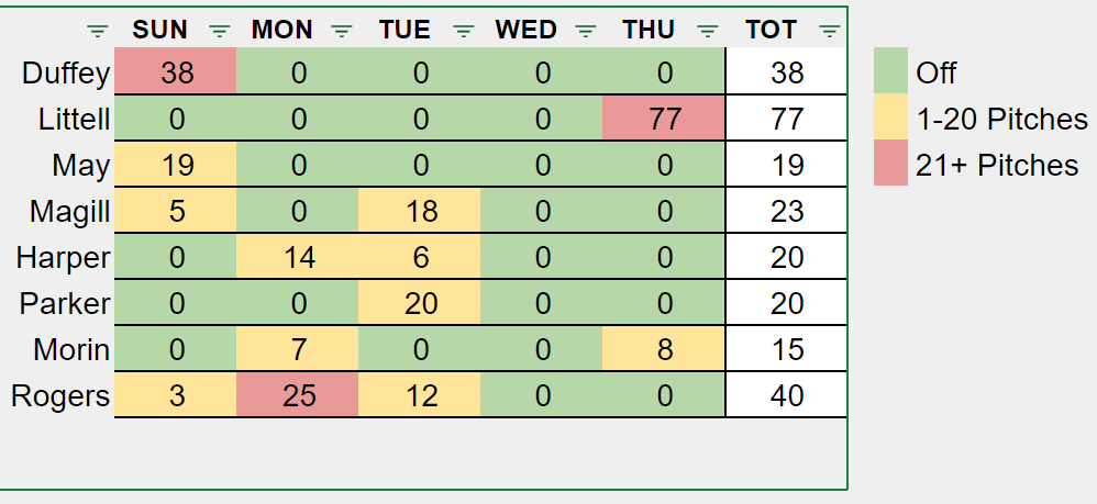 Here’s a quick look at the number of pitches thrown by the bullpen over the past five days: