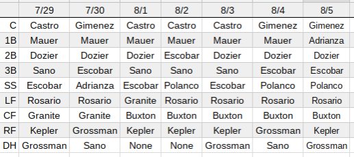 Joe Mauer was getting an off day against a tough lefty and Miguel Sano was forced to sit after being hit in the wrist/hand by a pitch on Friday night. Both of their absences were 100 percent understandable, but since the Twins are still carrying an eight-man bullpen, Paul Molitor was very limited in his options for replacements.
