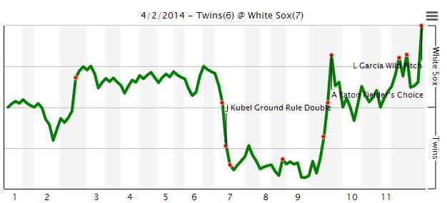 It all evened out for Correia, much to Twins fans chagrin. Glen Perkins blew the save, allowing the White Sox to tie the game in the ninth and so Correia got a “no decision.” Then Sam Deduno and Kurt Suzuki teamed up to lose the game in the 11th on a wild pitch. You can see the FanGraphs.com chart that shows the Twins/White Sox chances of winning that game to the right.