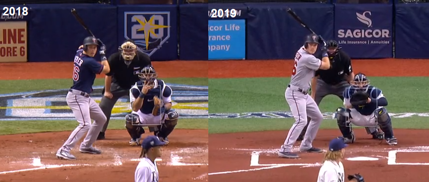 With momentum carrying toward home plate, this limited his ability to turn and open up on a pitch effectively. This is why he hit more of his hard hit balls to center instead of pulling them. You might also notice is occasional toe tap he implements in 2019 as well. With the shortened stance, this helps him stay back instead of aggressively attacking the pitch and pulling it foul.