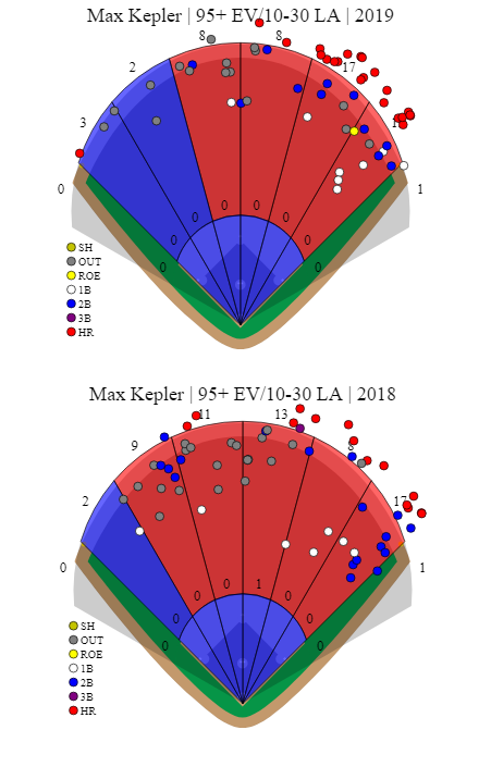 Even with a vow of returning to his previous methods and avoid getting caught in a launch angle-centric trap, Kepler entered 2019 hitting the ball in a very similar manner that he did the year before -- in the air. The difference was that rather than sending the balls with premium contact into the big part of the field, with adjusting his set-up, Kepler started to pull the ball: