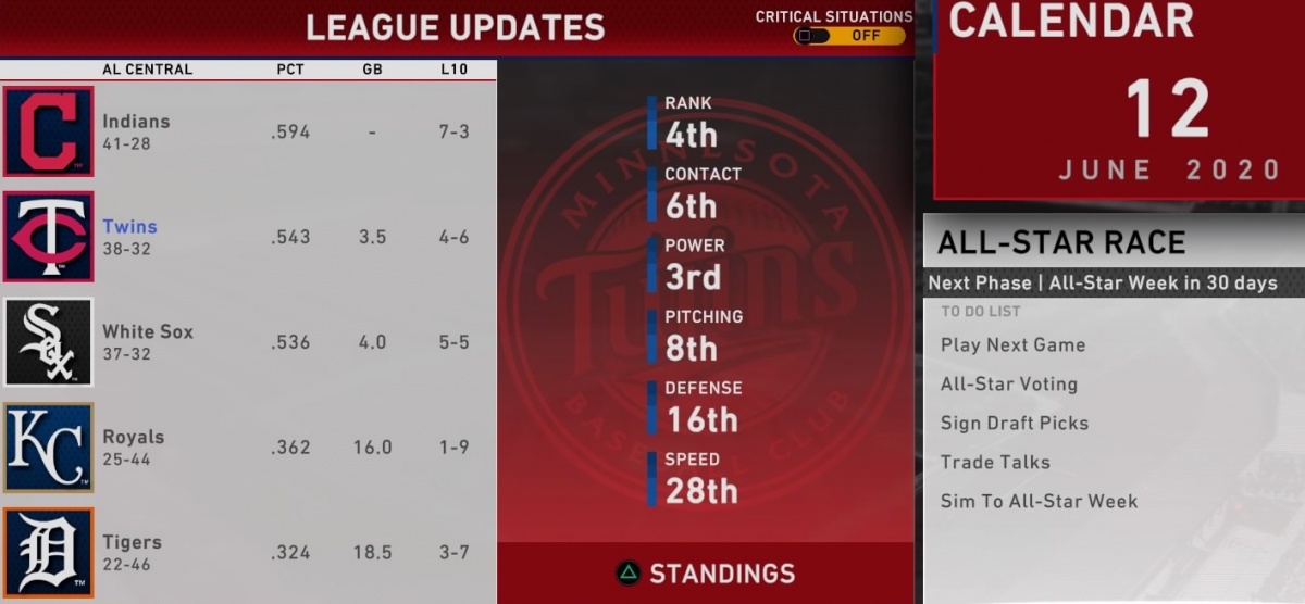 To get caught up on what we're doing here, you can check out the introductory post in the series for an explanation of the premise and setup. But the quick version is this: We're playing a progressive simulated Twins season on MLB The Show 20 on PS4, and y'all are helping guide the ship. In each installment I'll update you on what's happened since the last, and put at least one key decision up for vote.