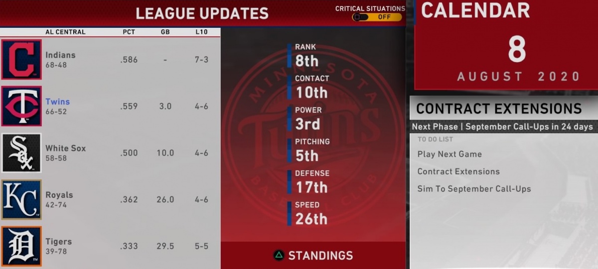 To get caught up on what we're doing here, you can check out the introductory post in the series for an explanation of the premise and setup. But the quick version is this: We're playing a progressive simulated Twins season on MLB The Show 20 on PS4, and y'all are helping guide the ship. In each installment I'll update you on what's happened since the last, and put at least one key decision up for vote.