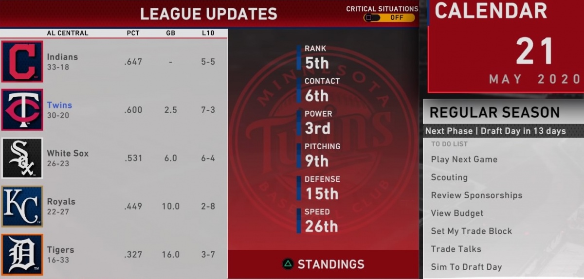 To get caught up on what we're doing here, you can check out the introductory post in the series for an explanation of the premise and setup. But the quick version is this: We're playing a progressive simulated Twins season on MLB The Show 20 on PS4, and y'all are helping guide the ship. In each installment I'll update you on what's happened since the last, and put at least one key decision up for vote.