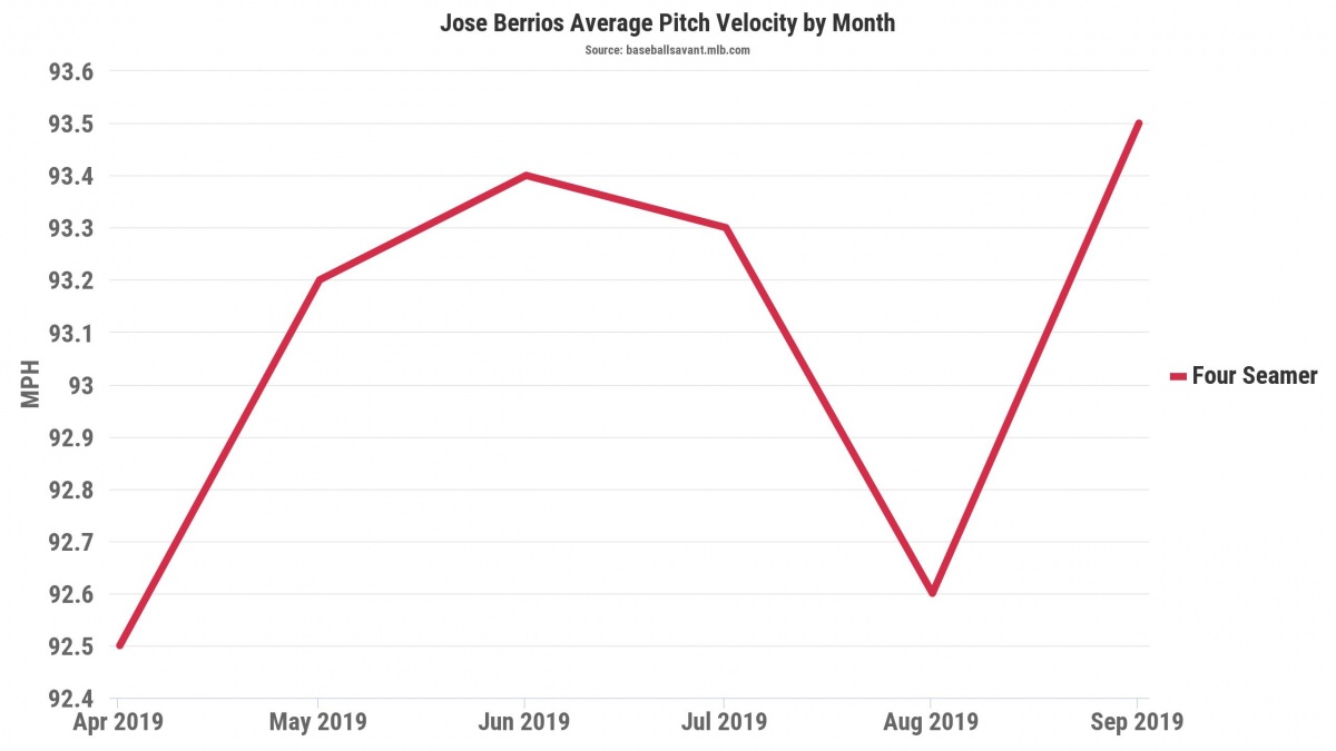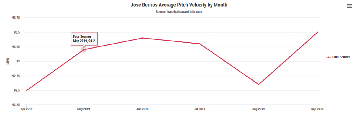 Luckily there has been good news in his most recent starts regarding the velocity that seemingly disappeared on his fastball in August. It has gone back up to a 93.5 MPH average which is just a tick above his best month this season. In June when his velocity was this high, he posted an elite 2.06 ERA and earned himself a trip to the All-Star Game.