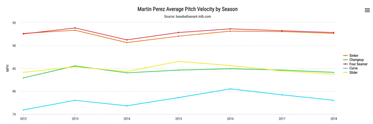 Additionally, many of the Statcast metrics also tell the story of Perez being nearly the same pitcher in 2018 that he was in 2016 & 2017. When a pitcher has a down season it often coincides with a decrease in pitch velocity. This can often be worrisome to MLB teams as it can be an indicator that the pitcher has fallen off physically. However, when looking at Martin Perez, that doesn’t seem to have been the case, as is evident by the chart seen below.
