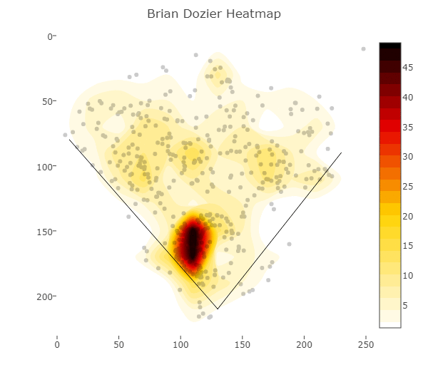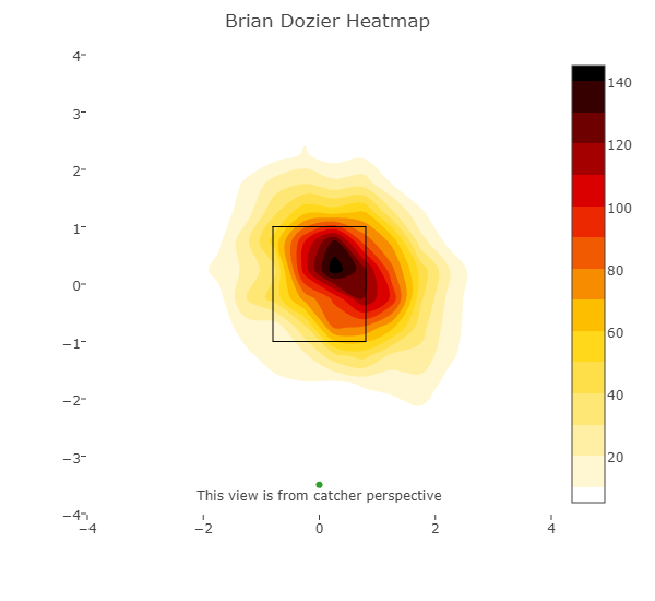 As much of a pull hitter as he’s turned into, Dozier hasn’t been that drastic of a fly ball guy. His launch angles have hovered around the high 12 or 13 degree mark on base hits, although this year the average has dipped down to 11.9. Combine that with an exit velocity that’s sitting at a four-year low of 90mph, and it’s no wonder why the 29.5% hard hit rate is a low water mark dating back to 2015. In summarizing the batted ball output, we’re seeing Dozier hit the ball more softly, at a less optimal launch angle, more often this year. It’s definitely why he owns just a .243 BABIP on a .225 average. By trying to pull pitches low and outside, he's only able to reach the middle of the field, as opposed to his desired left side.