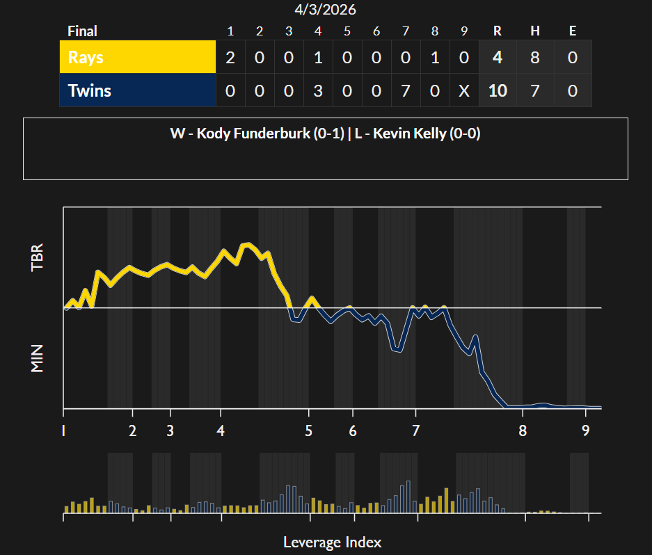 Rain started to fall on the field after the slam. Even Mother Nature knows when a game is over. Tampa Bay scratched across a run for window-dressing; Cody Laweryson closed matters in a now pounding precipitation with an easy 1-2-3 frame, giving the Twins a win in their 2026 home debut.