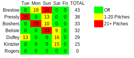 This is a new feature today. I figured since the bullpen has become such a story line this season I’d work something in that may provide insight into who may be available the next night.