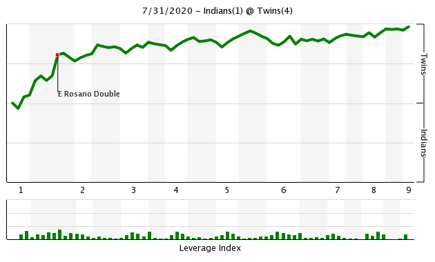 While Twins batters didn’t produce runs in the following two innings, they did manage to wear out Clevinger. The Indians starter was done after concluding the fourth, inning in which Minnesota drew three walks, two of them after two outs. Meanwhile, Dobnak did a great job keeping Cleveland scoreless through five, despite allowing some strong contact (his average exit velocity was 94.5 MPH). In fact, only three out of the thirteen balls in play he allow actually materialized into hits.