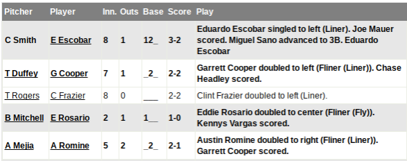 Kennys Vargas was due up next, but instead Paul Molitor turned to lefty killer Eduardo Escobar (.902 OPS vs. LHP entering tonight) to face southpaw Caleb Smith, who was making his major league debut. Escobar lined a single to left that scored Mauer from second. That was followed by an Eddie Rosario double that plated Sano.