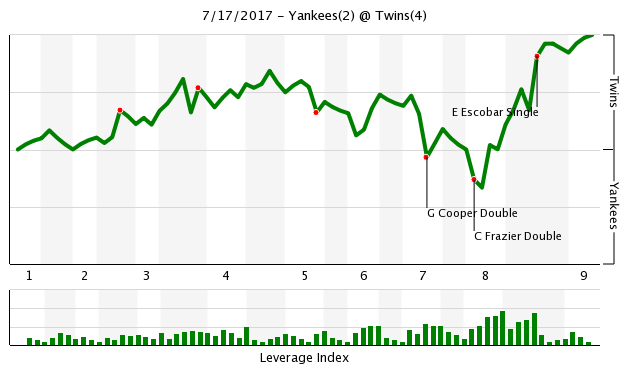 Luckily Taylor Rogers recorded the final out of that inning and had a scoreless eighth, because that’s what Taylor Rogers does. He picked up his fifth win. Brandon Kintzler pitched through heavy rain, but was able to retire the Yankees 1-2-3 on just 10 pitches, because that’s what Brandon Kintzler does. It was Kintzler’s 26th save of the season.