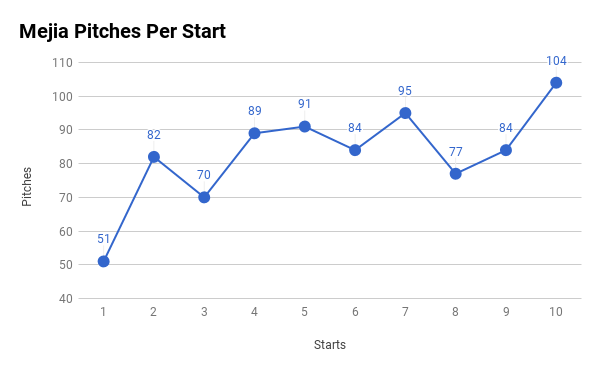 Mejia broke 100 pitches for the first time as a big leaguer. Here’s a look at his pitches per start in 2017: