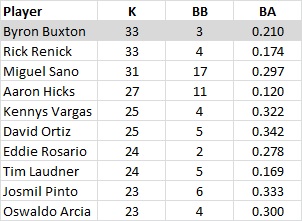 Here are the highest strikeout totals for a Twins player in his first 22 games, along with walks and batting average.