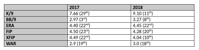 Despite achieving similar overall value, the pen went from almost last to almost top ten in strikeouts. While the Twins bullpen wasn’t a strength in 2018, it was improved. Significantly, if the Twins hadn’t been so remarkably out of contention by the trade deadline and had benefited from a full season of Trevor May, they would have ended up with four top 50 relievers (Taylor Rogers, Ryan Pressly, Trevor May, and Zach Duke).