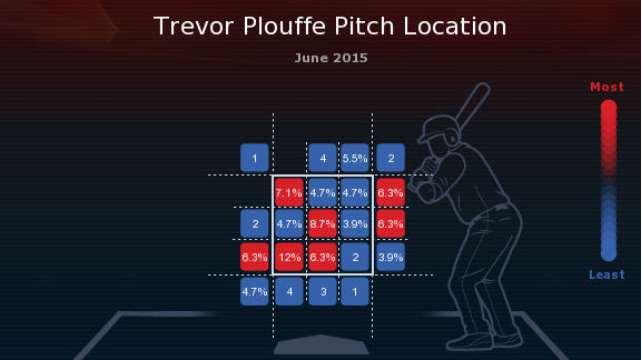 Not surprising, Plouffe’s chase rate grew in June as well with the majority being swings at pitches inside off the plate. This expansion of the zone has led to weaker contact as well as a drop in walks. Possibly because of his determination to drive runners in, Plouffe’s walk rate suffered in this time as well. Dating back to May 21, he has drawn just one walk in 62 plate appearances.