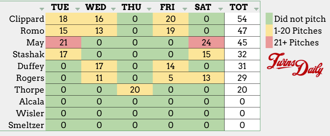Taking a look at the bullpen chart, I have to suspect Devin Smeltzer will be the “primary pitcher” for the Twins today. He gave up 13 earned runs in 17 2/3 innings pitched against Cleveland last season.